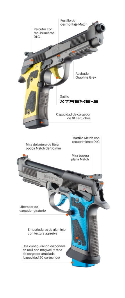 El percutor y el icónico martillo 92X esqueletado están recubiertos con DLC, para una resistencia superior y la reducción de todas las fricciones para un funcionamiento más suave. El martillo tiene una geometría rediseñada que permite una reducción del recorrido del 30%. El gatillo Xtreme-S® de las pistolas de doble acción/acción simple es ajustable para el recorrido (y posteriormente para el rearme), lo que permite un ajuste fino según las preferencias del tirador. Este mecanismo de disparo puede reducir el rearme del gatillo hasta en un 40%, pero mantiene el bloqueo del percutor, garantizando la seguridad de la pistola en caso de que se caiga. También se puede ajustar la liberación, pero necesita un martillo de acción simple solamente, que el tirador debe adquirir por separado. Con el Xtreme-S®, la 92X Performance tiene un peso estándar de 1,5-2,0 kg en simple acción y de 3,0-3,5 kg en doble acción. Esto convierte al Xtreme-S® en el gatillo de pistola más avanzado que Beretta ha producido nunca, representando un nivel de innovación que satisface las necesidades de los tiradores más refinados y exigentes. El pestillo de desmontaje Match simplifica y acelera el desmontaje para el mantenimiento, garantizando una limpieza y ajustes rápidos durante las tiradas de alta intensidad.